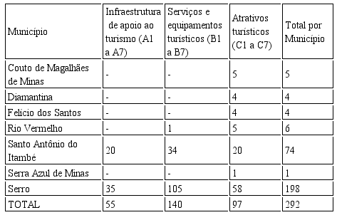 A partir das pesquisas realizadas, foram identificados aspectos quantitativos e qualitativos referentes à oferta turística da APA das Águas Vertentes. Foi diagnosticado o enorme potencial turístico da área, apresentando 97 atrativos turísticos presentes em todos os municípios abrangidos pela APA. Foram identificados 55 elementos constituintes da infraestrutura de apoio ao turismo, localizados em Serro e Santo Antônio do Itambé; e 140 equipamentos e serviços turísticos distribuídos em sua maioria também entre esses mesmos municípios. Esses locais se destacam em função de serem os municípios com maior percentual de área de abrangência da APA; pelo fato de Santo Antônio do Itambé possuir toda a sua área urbana inserida na APA; e em função de Serro possuir os distritos de Milho Verde, São Gonçalo do Rio das Pedras e Capivari no interior da UC, que são destinos turísticos importantes e apresentam maior quantidade de atrativos e serviços turísticos. Tais números podem ser visualizados no Quadro 2, abaixo.
