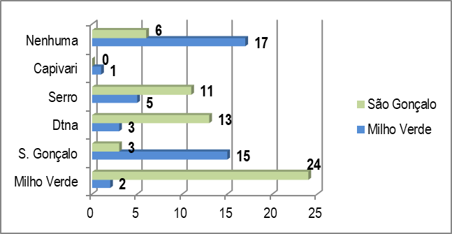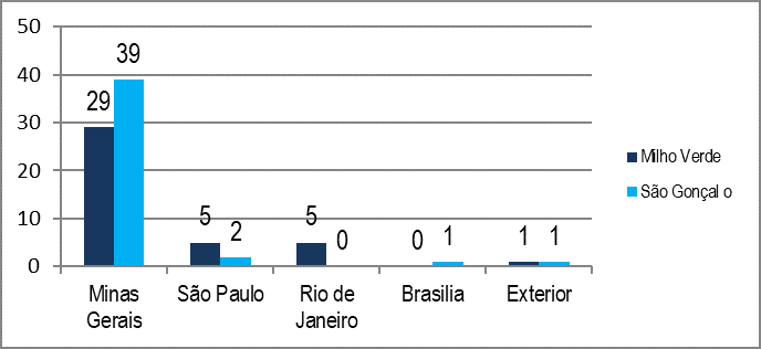 Quanto à procedência dos turistas, a pesquisa revela que o distrito de Milho Verde recebeu mais públicos de outros estados como São Paulo e Rio de Janeiro em relação a São Gonçalo, onde prevaleceram os turistas do Estado de Minas Gerais (Figura 4).