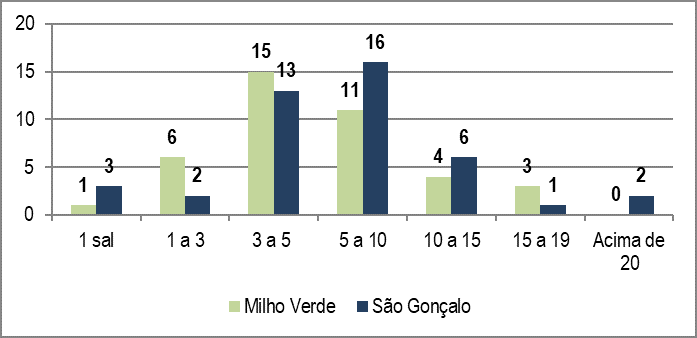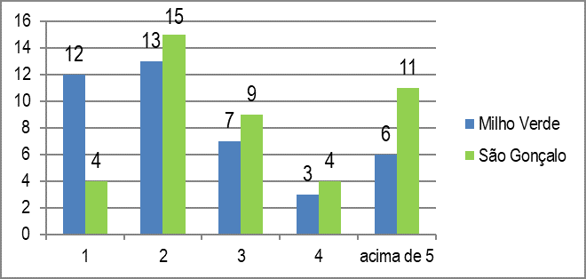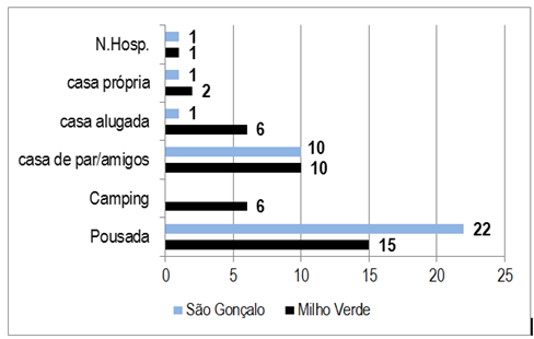 A pesquisa revelou ainda que os turistas permanecem por mais dias na região. A média varia entre dois a cinco dias, sendo que em Milho Verde nota-se um ligeiro aumento de permanência em relação a São Gonçalo, Figura 11. É importante lembrar que nem sempre o público que permanece por mais tempo contribui mais economicamente para o local. A Figura 12 revela que 25 entrevistados em Milho Verde se hospedaram em casa alugada ou de amigos e campings, ou seja, opções mais econômicas. Já em São Gonçalo, 22 entrevistados revelaram que hospedaram em pousadas, seguidos de 10, que optaram por casa de amigos.