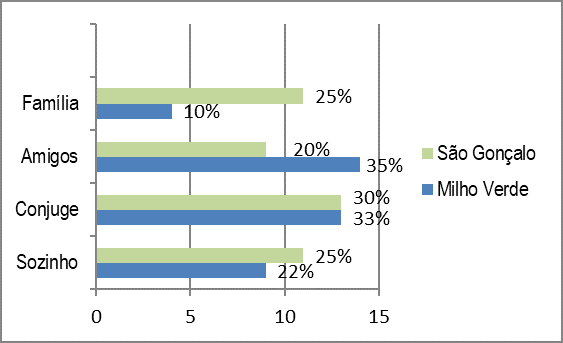 Os dados sobre “com quem viaja” confirmam a diferença do perfil do público. Milho Verde atrai um público mais jovem, geralmente acompanhado por amigos, conforme Figura 10. Já em São Gonçalo, prevalece um perfil de turista que vai acompanhado por cônjuges e que geralmente leva os filhos. Portanto, podemos deduzir que Milho Verde recebe um público com perfil menos familiar e mais jovial.