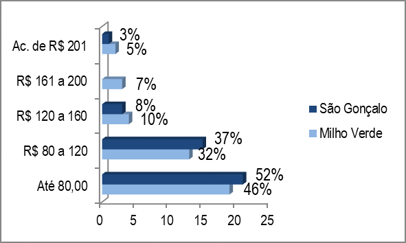 Por outro lado, apesar de São Gonçalo possuir um público com poder aquisitivo ligeiramente mais alto, nota-se que os turistas, em sua maioria, pretendem gastar até R$ 80,00, seguido de R$ 80,00 a R$ 120,00. Quanto a Milho Verde, 46% dos entrevistados pretendiam gastar até R$ 80,00, entretanto, 22% dos entrevistados declararam gastar acima de R$ 120,00, contra 11% do público de São Gonçalo, conforme Figura 13. Esse dado pode ser explicado pelo fato de que o turista de Milho Verde por optar por hospedagens mais econômicas podem destinar recursos para outras atividades. Outro fator importante é que por Milho Verde possuir mais opções de entretenimento noturno, como bares, casa de shows e outras programações, pode contribuir para a diversificação da oferta turística e, consequentemente, para investimentos do turista.