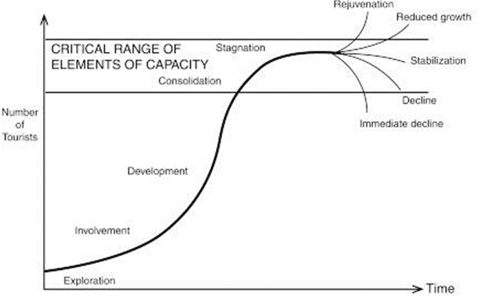 Outro autor que contribuiu para a noção do desenvolvimento do turismo e seu processo de evolução em um destino foi Butler (1980). Esse autor foi o primeiro a criar a noção de “ciclo de vida” turística em uma comunidade (Figura 3) e, segundo ele, a representação do funcionamento do espaço turístico seria a base dos modelos de evolução dessa atividade.