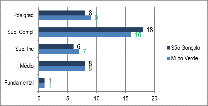 Quanto à escolaridade dos turistas entrevistados, percebe-se que o perfil do público de Milho Verde e de São Gonçalo é relativamente semelhante. A maioria já possui curso superior completo e outros já cursaram pós-graduação, ou seja, os frequentadores dos dois distritos possuem um nível de escolaridade alto, conforme Figura 6.