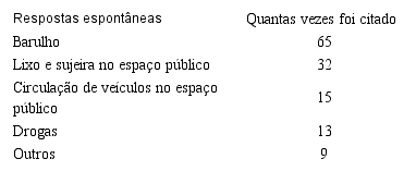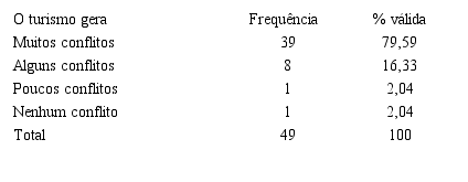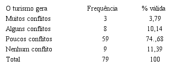 Essa pesquisa também foi realizada em São Gonçalo do Rio das Pedras pelo mesmo autor e contou com 79 pessoas respondentes, incluindo a Secretaria de Turismo do Serro. Os dados gerados com essa pesquisa revela que para a maioria dos entrevistados em São Gonçalo, o turismo gera “poucos conflitos”, conforme Tabela 3. Podemos perceber ainda pela Tabela 4 que esses conflitos são causados, muitas vezes, pela poluição sonora e lixo nos espaços públicos, demonstrando que os problemas em relação ao turismo praticado em São Gonçalo são mais fáceis de serem resolvidos do que em Milho Verde.