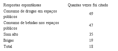 É importante ressaltar que os problemas gerados pela atividade turística nos dois vilarejos já haviam sido mencionados em outras pesquisas. A tese de doutorado de Bessa (2011) intitulada “A construção das paisagens turísticas nos descaminhos da Estrada Real” busca discutir a relação do desenvolvimento turístico e a participação comunitária nos dois vilarejos. Com o intuito de identificar quais os conflitos gerados pelo turismo local, o autor, em visita a Milho Verde aplicou questionários a: 01 funcionário da Secretaria de Turismo de Serro, a 03 informantes-chave e 49 moradores, incluindo 05 empresários locais. Podemos perceber os resultados dessa pesquisa ocorrida em Milho Verde, na Tabela 1. Os dados revelam a percepção da comunidade em relação ao turismo praticado no distrito. Para a maioria dos entrevistados de Milho Verde, o turismo gera “muitos conflitos”. Sobre as principais causas de conflitos ocorridos em Milho Verde oriundos da relação turista-comunidade, os moradores locais apontaram o consumo de drogas, bebidas alcoólicas nos espaços públicos, seguidos da poluição sonora, conforme Tabela 2.
