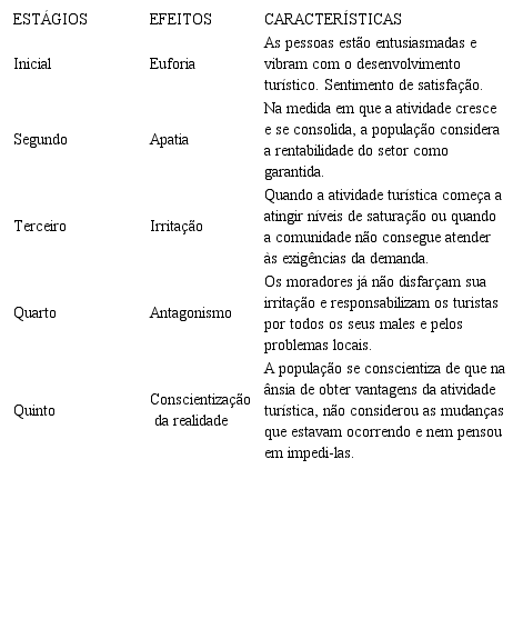 Ainda sobre os impactos socioculturais, Ruschmann e Solha (2006) apontam alguns estágios diferenciados de convivência das comunidades receptoras com as atividades turísticas ao longo do tempo, conforme Quadro 1. O último estágio culmina na conscientização da realidade, em que a comunidade percebe que na ânsia por lucros advindos do turismo, abriu mão do seu conforto e dos seus costumes e desconsiderou as mudanças que estavam ocorrendo e nem pensou em como evitá-las.