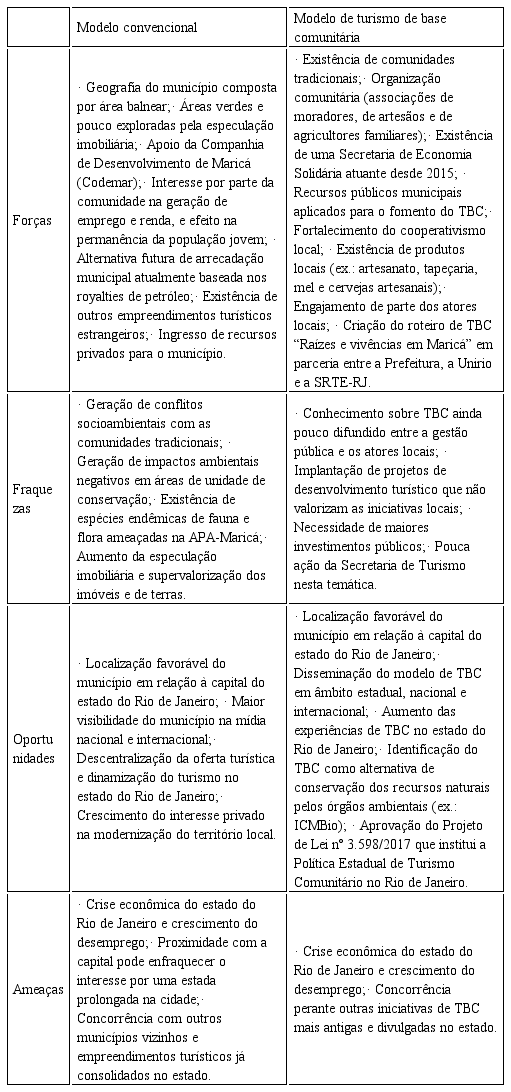 A seguir é apresentada a análise Swot, de caráter preliminar, para o contexto de Maricá, nos cenários de desenvolvimento do turismo convencional e do turismo de base comunitária (Quadro 1).