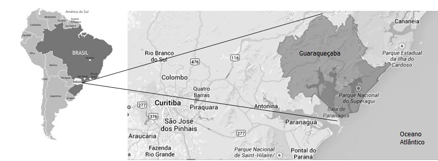 O município de Guaraqueçaba, localizado no litoral norte do estado do Paraná (Figura 1), recorrentemente é caso de estudo na análise de conflitos relativos à instituição e gestão de UCs, visto seu contraste ao contexto estadual de riqueza econômica e degradação ambiental. Enquanto o Paraná é a quinta maior economia brasileira e apresenta alto Índice de Desenvolvimento Humano (IDH) (0,749) (quinto no ranking brasileiro), Guaraqueçaba apresenta baixo IDH (0,587)[3](IBGE, 2010), o quarto pior do estado e abaixo de países como Honduras (0,606) e Congo (0,591) (PNUD, 2015).