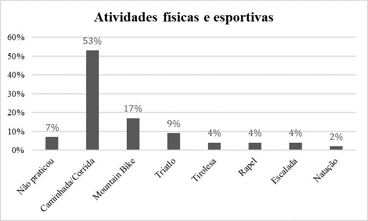 Observa-se que 4% da amostra praticou rapel e escalada, mesmo sendo proibidos no Peit, e 9% praticou o triatlo, modalidade que combina natação, ciclismo e corrida. Resultados similares foram encontrados por Tahara e Schwartz (2003) em estudo realizado no Parque das Cachoeiras e da Cachoeira do Paraíso, em Ipatinga/MG, que investigou as principais atividades de aventura na natureza usufruídas no âmbito do lazer; e por Garcia, Kowalski e Alves (2009), que procuraram compreender a visão do público que visita o espaço natural público da Mata do Paraíso, em Viçosa-MG. Assim como no Peit, nesses espaços o conteúdo cultural mais praticado foi o de interesse físico-esportivo, sendo desenvolvidas atividades de caminhada em trilhas, rapel e escalada.
