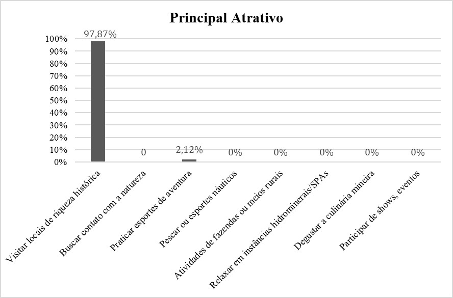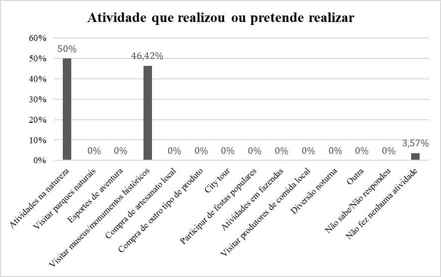A Pesquisa de Demanda Turística de Minas Gerais (2017), ao analisar o perfil do visitante no estado, mostra que 40% dos turistas são motivados por lazer/passeio, sendo que, destes, 46% buscam o turismo cultural, 36% ecoturismo e 7% eventos/diversão noturna. Quanto aos turistas de Ouro Preto, especificamente, a pesquisa revela que a maioria é motivada por lazer/passeio (82,14%) e que, embora o principal atrativo para visitar a cidade seja os locais de riquezas históricas, metade desse público, quando questionado sobre outra atividade que realizaria ou pretendia realizar na cidade, indicou atividade na natureza (Figura 4).