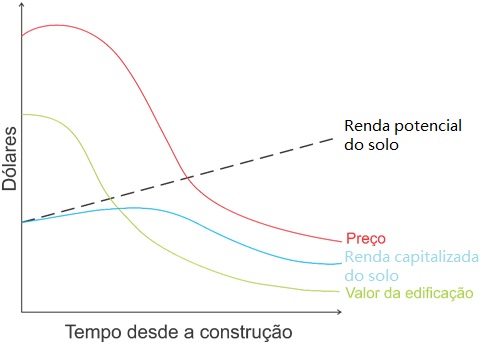 Na primeira (novas construções e o primeiro ciclo de uso), uma nova construção reflete o valor tanto da terra quanto do edifício. Com as construções ao redor e o desenvolvimento da área, o valor da propriedade aumenta em um primeiro momento, embora o preço da edificação comece a cair. Os preços das edificações caem por três motivos: aumento na produtividade, obsolescência arquitetônica e depreciação da estrutura física. O aumento da produtividade provoca uma melhor utilização dos recursos, permitindo aos construtores edificar uma mesma estrutura gastando menos. A obsolescência arquitetônica é um estímulo pouco importante para refletir na queda do valor de propriedades, mas possui uma parcela de influência. Já a depreciação da estrutura física é um fator importante na queda dos preços da edificação, dependendo da manutenção dada ao longo do seu uso.