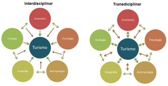 Por su parte, el cuarto punto hace hincapié en gran parte de la bibliografía que se ha escrito no necesariamente tiene como campo o disciplina base al turismo. Encontramos, en virtud de ello, numerosos trabajos que traspolan conceptos utilizados en otras ciencias o disciplinas, a veces de manera descontextualiza de las teorías que le dieron origen o sentido. El proceso que se genera como resultado es una predominancia de enfoques multidisciplinares e interdisciplinares – tal como se puede observar en el grafico a continuación – y no tanto así en un ejercicio transdisciplinar. En esta línea, Pocock (2009) sostiene que un número importante de los científicos investigan desde su disciplina base, arraigados a los conceptos y teorías de la misma, prescindiendo de una mirada holística integradora. La abundancia de estudios desde la multidisciplinariedad ha provocado una fragmentación en las investigaciones turísticas y, en efecto, a una notoria tematización desde aspectos económicos, sociales, geográficos, psicológicos, sin una suficiente interrelación/diálogo entre las mismas. Campodónico y Chalar (2010, p. 13) agregan que “esta es una de las razones por las cuales existe un gran retraso en la elaboración de marcos conceptuales en turismo pues los enfoques disciplinares no permiten lograr una visión integral de los problemas planteados”. Ante este status quo investigativo, algunos autores, tales como Sayer (1995 apud TRIBE, 2005b) reclaman y sostienen que se requieren abordajes post-disciplinares, donde los investigadores dejen a un lado las disciplinas, donde se identifiquen con el conocimiento, antes que con las disciplinas.