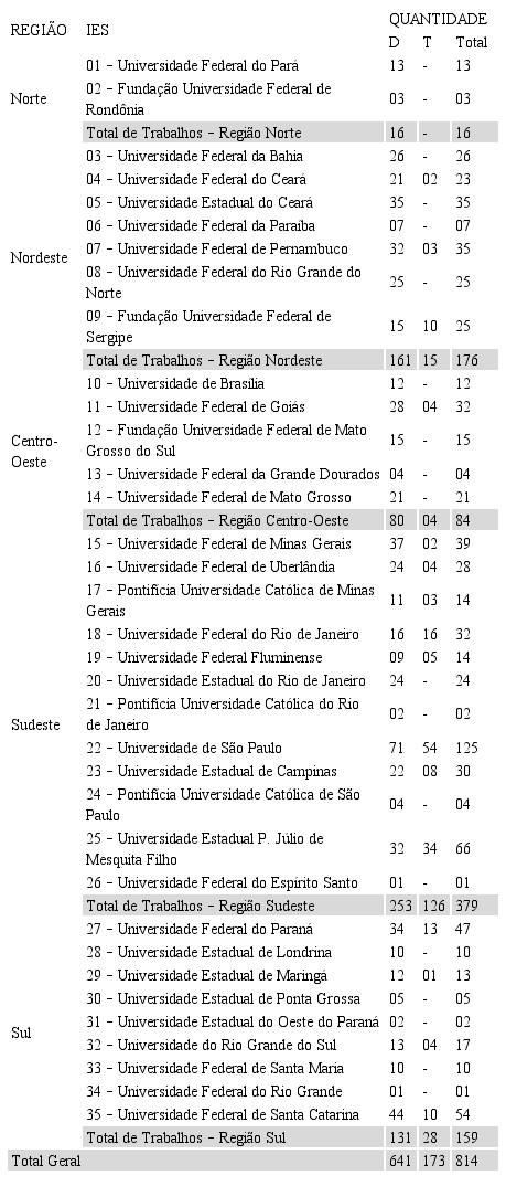 Meditando sobre os dados expostos na Tabela 2, destaca-se a Região Norte como a maior das cinco regiões brasileiras que, no entanto, apresenta o menor quantitativo de programas de pós-graduação stricto sensu em Geografia relacionados com a temática do turismo e, consequentemente, a minoria dos estudos triados (teses e dissertações). Essa informação vai ao encontro da demanda identificada nas avaliações feitas pela Capes, que menciona a necessidade de descentralização e incentivo da criação de novos cursos de mestrado e doutorado no Norte do País, interiorizando a espacialização dos programas no Brasil (BRASIL, 2013).
