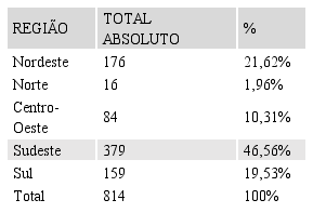 Dados da pesquisa, 2016Considerando os dados apresentados na Tabela 1, informa-se que dos 65 programas brasileiros de pós-graduação em Geografia, 44 deles contam com pesquisas (teses e dissertações) que utilizam da temática do turismo em suas problematizações, ou seja, cerca de 67,70% dos programas brasileiros de pós-graduação stricto sensu em Geografia. Paralelo a essa informação, nota-se que 21 programas de pós-graduação, ou seja, 32,30%, não apresentaram nenhum estudo ou pesquisa que aborde o turismo enquanto temática. Revela-se, com isso, uma importante representatividade da temática do turismo nos estudos geográficos (teses e dissertações) no âmbito da pós-graduação no Brasil.