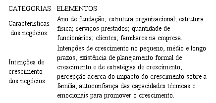 As evidências foram coletadas por meio de entrevistas pessoais semiestruturadas com as cinco empreendedoras. Além disso, foram observados documentos, como os sítios das empresas com o intuito de identificar os tipos de serviços prestados e informações gerais das empresas. As entrevistas foram gravadas e depois transcritas na íntegra. Gomes (1996) propõe a utilização de categorias específicas como forma de análise dos dados conhecidos em uma pesquisa qualitativa. Para o autor trabalhar com categorias, significa agrupar elementos, ideias ou expressões em torno de um conceito capaz de abranger tudo isso. O Quadro 1 apresenta as categorias analíticas e os elementos de análise adotados para o estudo dos casos.