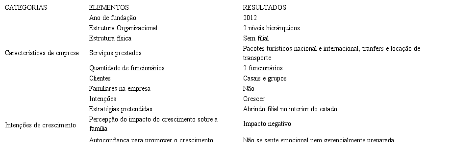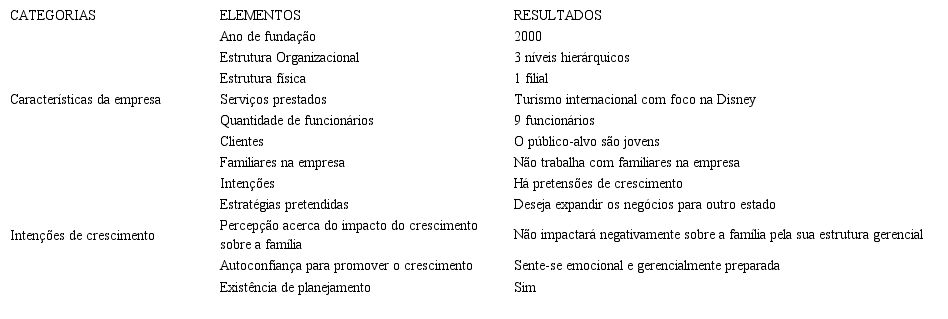Ao se observar as características da agência 1, verificou-se que as atividades da empresa foram iniciadas com estrutura mínima, composta por um celular e um computador. Atualmente, possui duas lojas, com nove empregados, entre esses gerentes, mas nenhum membro da família. Utiliza atualmente sistemas de informações gerenciais que dão suporte aos processos da empresa. O foco da empresa é o turismo jovem, cujo destino mais importante é a Disney. Com relação às intenções de crescimento, a empreendedora revelou inicialmente que sua forma descentralizadora de gerenciar a empresa lhe dá flexibilidade e condições de crescimento, como explicou: