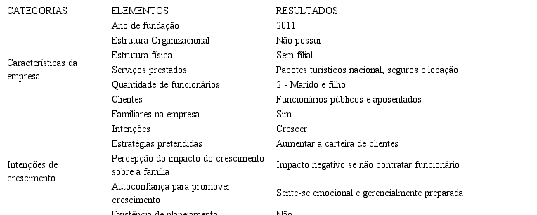 No tocante às características da agência de viagens 2, verificou-se que a data de fundação foi em 2011. Atualmente, conta apenas com a ajuda de pessoas da família, o esposo que é sócio da empresa e o filho, que está registrado como empregado. Embora a estrutura seja enxuta, sem níveis hierárquicos, há uma divisão de tarefas entre os que trabalham na empresa. Sua experiência em trabalhar com a família é positiva, e de seu relato percebe-se que essa relação lhe dá segurança e satisfação. A empreendedora atende vários públicos, mas seu foco está em funcionários públicos e aposentados. Os serviços prestados é basicamente a venda de pacotes turísticos, venda de seguro e locação de transportes.
