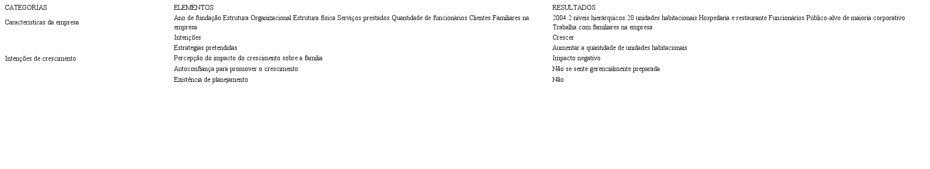 O Quadro 6 apresenta o resumo das categorias analíticas e elementos de análise do caso Pousada: