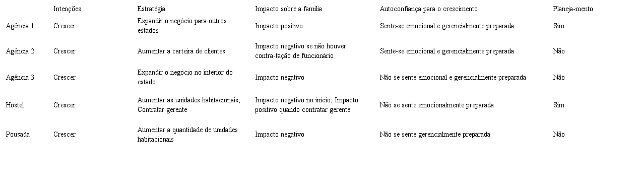 Observou-se que o crescimento do negócio é almejado pelas empresárias, porém, a forma de promovê-lo difere entre elas. A empreendedora da Agência 2 pretende desenvolver internamente sua empresa e aumentar a carteira de clientes, e as Agências 1 e 3 pretendem expandir o negócio em outros mercados abrindo filiais. Para as empresas hoteleiras, o crescimento está associado ao aumento das unidades habitacionais.
