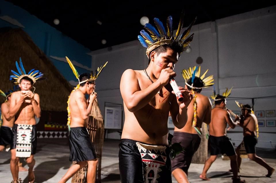 Além das exposições, o Musa também realiza palestras e encontros científicos relacionados à temática indígena; promove eventos com a apresentação de grupo de dança e outras manifestações culturais indígenas. Por meio de parcerias, o museu viabiliza apresentações em seu espaço e em outros locais de visibilidade na cidade, a exemplo do Teatro Amazonas, onde articulou a apresentação do grupo Mamaphia Bahsamorï Mahsa, que representou a cultura do Alto Rio Negro – os mitos e dança de Kariçu. Esse grupo conta com a participação de acadêmicos indígenas dessa região, a exemplo do artesão Dessana que cursa mestrado em Antropologia Social na Universidade Federal do Amazonas (Ufam). A Figura 4 destaca uma apresentação do referido grupo realizada no Musa.