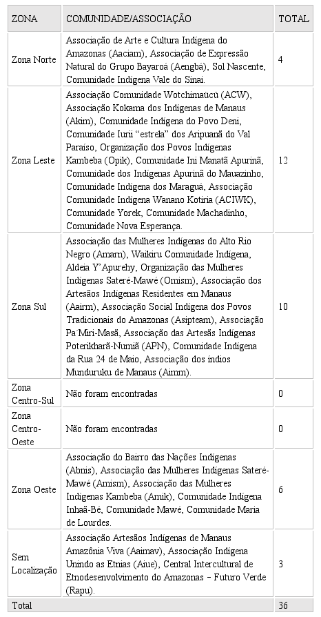 As zonas da cidade[4] com maior concentração de comunidades e associações indígenas são as Zonas Norte, Leste e Sul, notando-se um destaque para a Zona Leste com 35% do total. De acordo com Almeida e Santos (2009), Melo (2006) e Souza (2013), a concentração nessas zonas se dá, principalmente, por serem regiões com maior possibilidade para adquirir uma casa, por serem áreas de invasão e/ou por lhes permitirem comprar uma casa ou lote com preços baixos.