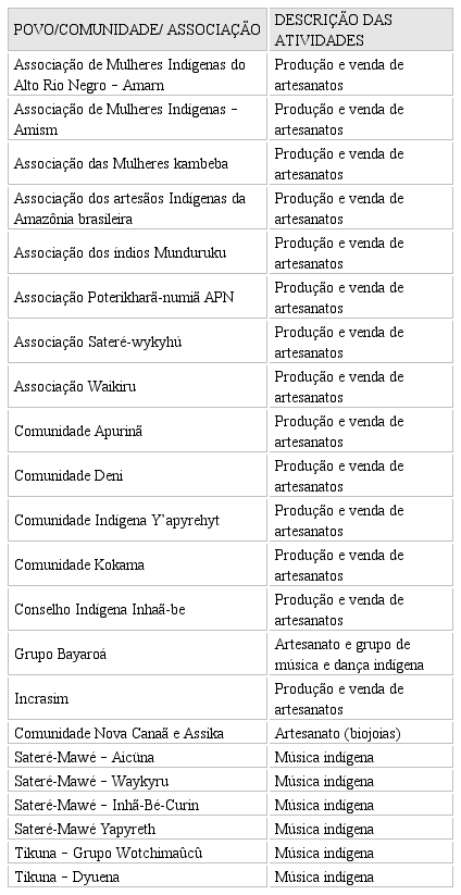 No Quadro 3 estão relacionadas 22 iniciativas criadas por comunidades e associações indígenas na cidade de Manaus, com o propósito de obterem renda. Vale observar que nelas há um papel central desempenhado pelas mulheres, pois muitas dessas iniciativas são conduzidas exclusivamente por elas e mesmo nas associações mistas, são as mulheres que fabricam e comercializam os produtos.
