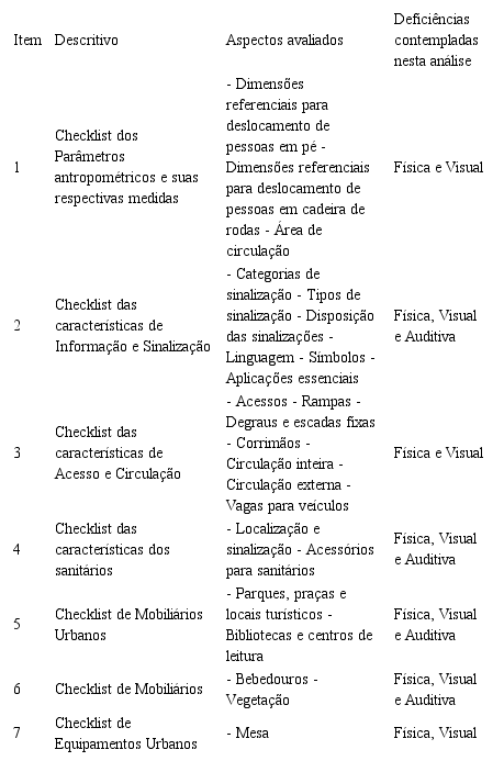 A apresentação dos resultados segue a ordem dos itens descritos no protocolo utilizado: parâmetros antropométricos; informação e sinalização; acessos e circulação; sanitários; mobiliários urbanos; mobiliários; equipamentos urbanos.