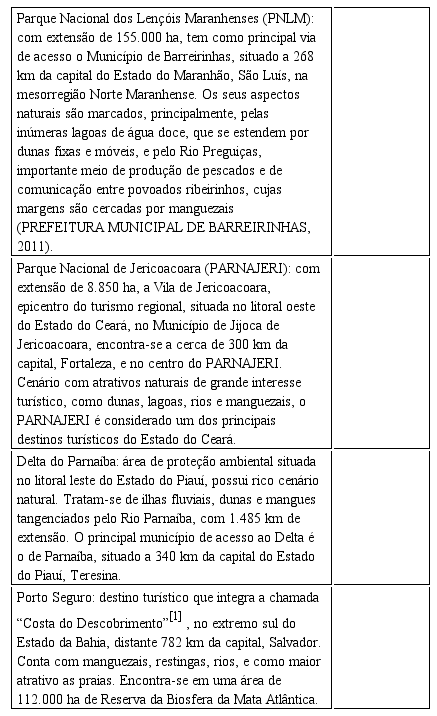 Os destinos turísticos definidos foram: (a) Lençóis Maranhenses, Município de Barreirinhas (Maranhão); (b) Jericoacoara, Município de Jijoca de Jericoacoara (Ceará); (c) Delta do Parnaíba, Município de Parnaíba (Piauí); (d) Porto Seguro, Municípios de Santa Cruz Cabrália e de Porto Seguro (Bahia). No Quadro 1 são apresentadas, resumidamente, suas principais características.
