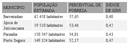 Os municípios têm uma demografia variada (entre 60 e 150 mil habitantes), e similitudes quanto à ampla incidência de pobreza e à concentração de renda (índice de Gini[2]). Na Tabela 1, nota-se que a pobreza atinge mais de 52% de suas populações, chegando a quase 60% no Município de Barreirinhas. Quanto à desigualdade de renda, o coeficiente de Gini atestou, em todas as localidades, um nível acima de 0,40.