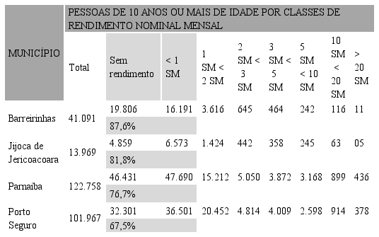 Nesse caso a exclusão social aqui atrelada é aquela da vertente conhecida por “exclusão social passiva” (ROGERS; JALAL; BOYD, 2008), que decorre de processos sociais em oposição aos legais, pois se refere às formas de inserção precária e restrições a oportunidades sociais e à falta de acesso a bens. É a própria “negação da cidadania”, processo múltiplo (NASCIMENTO, 1994), que se edifica na informalidade do trabalho e na baixa remuneração. Em todos os municípios estudados a porcentagem das populações locais com idade ativa (10 anos ou mais) que se encontra sem rendimentos ou rendimentos mensais menores que um salário mínimo, ultrapassa os 67%, como destacado na Tabela 2.