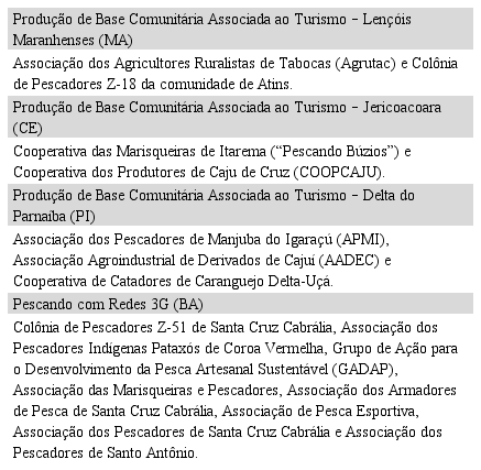 Desenvolvidos em distintos contextos, os projetos tinham objetivos comuns: promover a inclusão socioprodutiva de pequenos produtores (pescadores e agricultores) no sistema produtivo local de turismo, por meio de sua participação nos benefícios econômicos da atividade turística, a valorização da biodiversidade e da identidade cultural local. As ações focaram os produtores que se apresentassem formalmente organizados (organização coletiva de trabalho). Os projetos, e seus respectivos grupos de atores, estão destacados no Quadro 3.