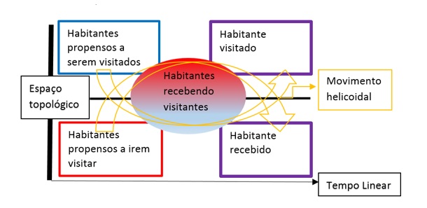 Assim, o turismo fica resumido na associação de uma dobra física e social pontual, formando um interstício socioespacial único. Essa trama específica só teria uma delimitação quanto ao propósito do tipo de relacionamento, o pacífico, entendendo o tecido formado por uma ação declaradamente bélica como distante ao opor a concepção, ao menos imediata, da intenção de construção/destruição. A derivação das relações entre habitantes e visitados inclui um termo que dá motivo principal ao conhecer o “outro lado”, mas ao mesmo tempo abarca outros encontros como visitante-visitante. Por fim, a opção de manter o conceito antropológico “Habitante” e “Visitante”, justamente por incorporar a ideia de habitat e hábito, aquilo que foge do seu habitar comum rumo a um habitar estranho (aproximando-se do conceito etimológico de experiência).