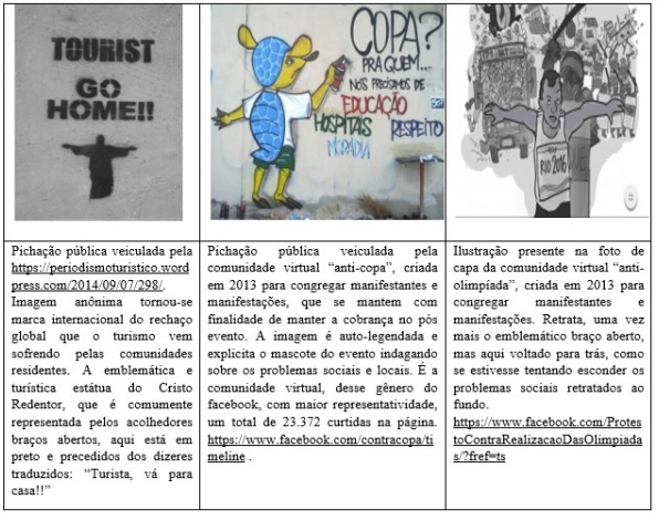Em 2 de outubro de 2009, na sede do Comitê Olímpico Internacional em Copenhagen, o presidente dos Estados Unidos da América e o presidente do Brasil (junto com toda uma comitiva nacional) duelaram publicamente para captar os Jogos Olímpicos 2016. O Brasil venceu, endossando a política nacional de turismo (BRASIL, 2010) explicitamente embasada em sediar megaeventos. Sendo que essa medida, que vinha aparecendo como contentamento geral, apresentou conflitoscomo mostra o quadro 1, os exemplos de redes físicas e virtuais das comunidades sedes, esboçando descontentamento com essa política de turismo.: