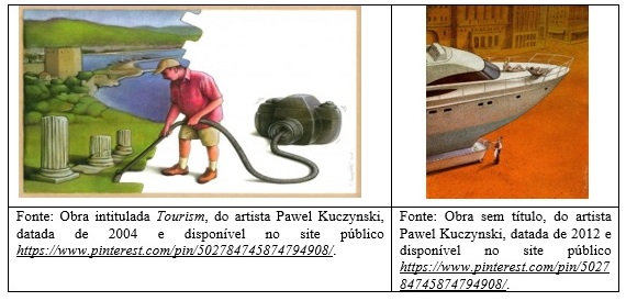 A primeira ilustração, com título de referência direta ao turismo, aponta o turista como degradador direto do espaço físico e cultural, com uma visão similar ao pensamento crítico exposto por Cohen (1988), na qual o sujeito turista é o grande gerador das mazelas do turismo em si, consolidando essa como prática humana geralmente degradadora e prejudicial. A segunda ilustração, apesar de uma identificação mais subjetiva ao turismo, remete ao pensamento crítico de MacCannell (2003), na qual o atrativo turístico em si (aqui em forma de um iate de luxo) é um problema, personificando a submissão do trabalhador local (aqui representado por um garçom) que vive em uma realidade (escassa e árida) distinta da que ele produz (um ilusório e simbológico turismo de lazer e luxo).