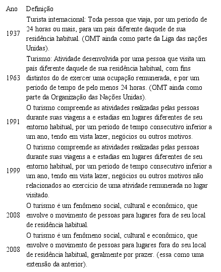 Nesse embate é que se entranha às questões conceituais, pontuando, em um primeiro momento, o posicionamento do órgão oficial de turismo, que legitima e apoia o desenvolvimento turístico mundial, em constante parceria com a organização das nações unidas. A OMT foi fundada em 1970, apesar de seu embrião ter se iniciado no Primeiro Congresso Internacional de Associações Oficiais de Tráfego Turístico, celebrado em Haia, maio de 1925, desde sua criação, apesar de ser o órgão oficial de turismo, sempre deixou claro que a centralidade de suas atividades é regulamentar e fazer estatísticas técnicas/operativas do deslocamento de turistas, esquivando-se da responsabilidade conceitual do termo (PAKMAN, 2014). Esse posicionamento é observado no histórico de conceituações de turismo, resumidas no quadro abaixo.