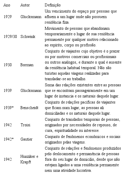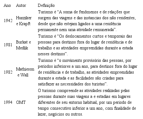 Especificamente sobre o conceito de turismo, o referido autor resgata as primeiras definições teóricas de turismo, justamente antes dos conceitos expostos da OMT (2001) que pontuou somente a partir de Krapft (quadro 4), e remonta os primeiros entendimentos acadêmicos de turismo pela escola de economia de Berlin.