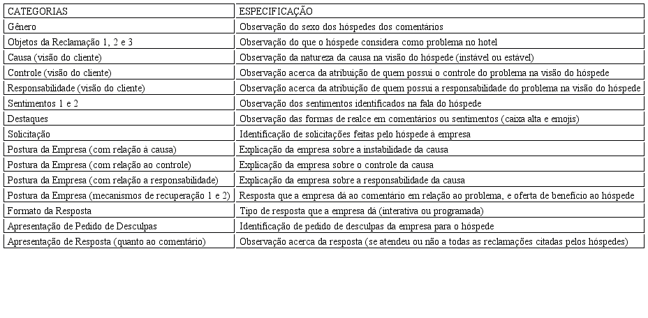 A partir da análise de conteúdo, foram observados nos comentários dos viajantes seus principais objetos de reclamação, as dimensões da teoria da atribuição em sua visão, seus sentimentos percebidos, o destaque dado por eles em seus comentários e as solicitações feitas. Já nas respostas dos hotéis observaram-se as suas posturas em relação à causa, ao controle e a responsabilidade do problema apresentado, os mecanismos de recuperação usados por eles, além de observar se a resposta da empresa era programada (utiliza a mesma resposta para vários comentários) ou interativa (resposta individual para cada comentário) e se a empresa respondeu a todos as observações levantadas pelos clientes.