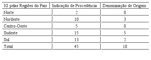 As regiões Norte e Centro-Oeste do país, apesar do grande potencial, da riqueza e diversidade histórica e biocultural são as que menos têm IGs reconhecidas, seguido do Nordeste que começa a reverter o quadro, em busca de estratégias de cooperação para identificar produtos com potencial de IG. Em relação aos novos depósitos para requerer o reconhecimento de IG, o estado que mais avançou foi o Paraná com oito pedidos, segundo dados do INPI. A Tabela 1 revela a distribuição de IGs pelas cinco regiões do país.