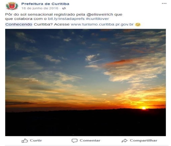 CURITIBA. Prefeitura Municipal. Pôr do sol sensacional registrado pela @elisweirich que que colabora com o bit.ly/instadaprefs. Disponível em: https://www.facebook.com/search/top/?q=%40elisweirich&epa=SEARCH_BOX. Acesso: 12 dez. 2017.