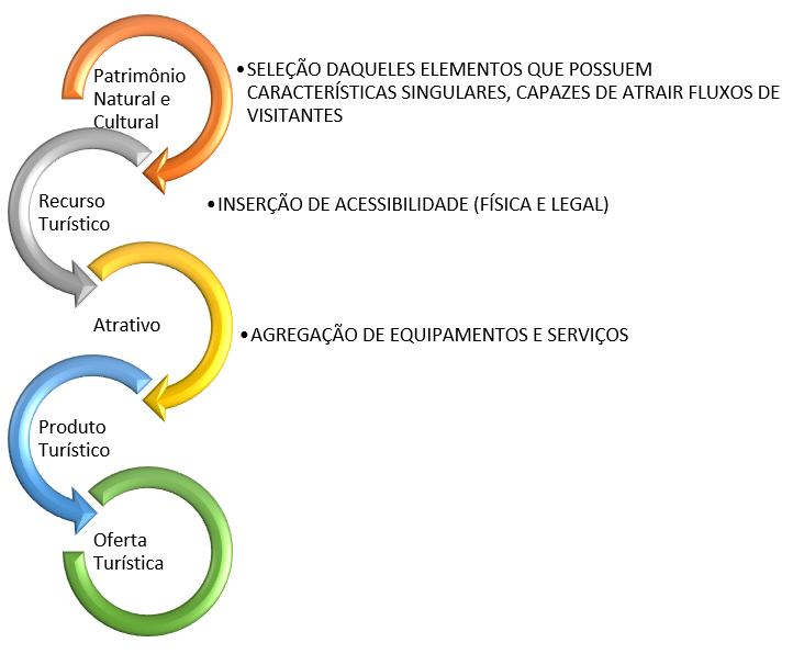 A transformação do patrimônio material e imaterial de um determinado trecho do espaço turístico em oferta turística é um processo complexo que exige um estudo detalhado e cuidadoso. De tal modo, preocupamo-nos em demonstrar como é este percurso do processo de turistificação (Knafou, 1996) e quais são as etapas e intervenções necessárias para que o resultado seja um produto turístico competitivo e coerente com as ansiedades e desejos da sociedade e do mercado contemporâneo. Estas informações auxiliam na transformação dos recursos em recursos turísticos e, posteriormente, em produtos turísticos ou na requalificação destes produtos.