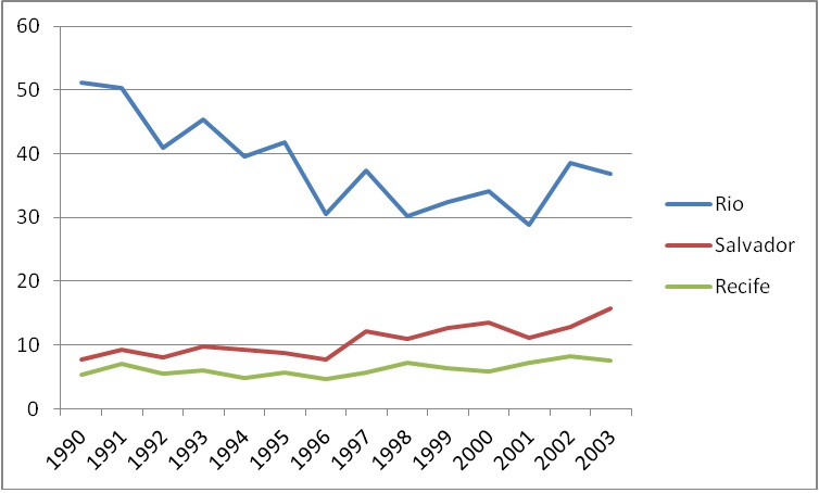 Tal cenário se deveu ao fato do primeiro poder executivo civil estadual pós ditadura ter desentendimentos políticos com setores da comunicação e a forma encontrada por eles para rivalizar foi divulgar na mídia nacional e internacional o resultado de sua política de segurança pública (Edra, 2014). Esta, tinha por base o respeito e a valorização dos trabalhadores, discurso que favoreceu construções irregulares no espaço urbano e a proliferação de favelas com proibição de incursão policial. Tal decisão acabou por multiplicar a violência e favorecer a criação de organizações criminosas especializadas em tráfico de drogas (Soares & Sento-Sé, 2000).