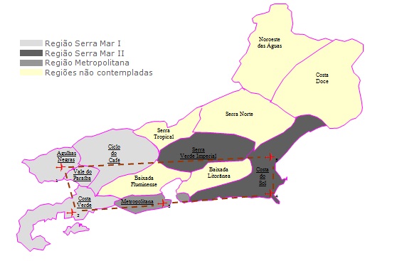 Se o projeto apresentado em 2005 com base no transporte aéreo não avançou conforme verificado no tópico 2. Se as forças do Estado foram desviadas para a estrutura dos megaeventos (Tópico 3). A “retomada do planejamento de turismo” no estado manteve as regiões potenciais apresentadas em 2005, pois com exceção do Vale do Paraíba, as outras seis foram mantidas: Metropolitana, Costa do Sol, Serra Verde Imperial, Vale do Café, Agulhas Negras e Costa Verde.