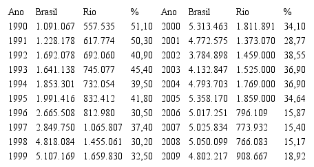 Os dados da tabela e figura 1 possibilitam observar a queda de visitantes na cidade do Rio de Janeiro entre as décadas de 1990 e 2000 [1], de 51,10% para 18,92%. Chama atenção que mesmo com o crescimento de turistas nos anos de 1995 e 1996 no total Brasil, a cidade do Rio de Janeiro apresentou redução. Situação semelhante no período entre 2002 e 2005. E, a partir de 2006, uma queda ainda maior.