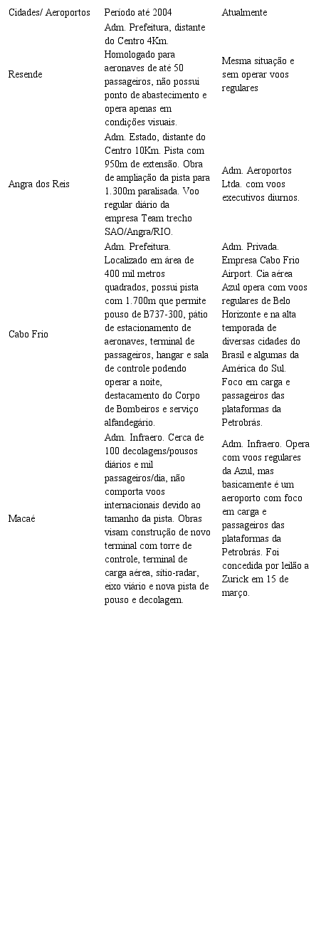 Percebe-se, com a leitura do quadro 1, que a ideia de utilizar os aeroportos como estratégia para a regionalização do turismo no estado do Rio de Janeiro não surtiu o efeito desejado, principalmente em função das características observadas nos aeroportos, na atualidade.