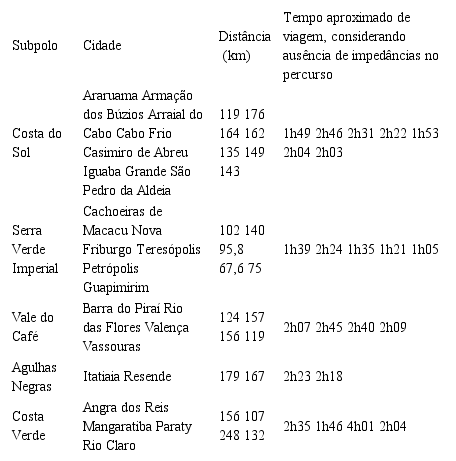 Conforme pode ser observado no quadro 2, com exceção da cidade de Paraty, todas as demais estão distantes da capital em percurso de até 3 horas.