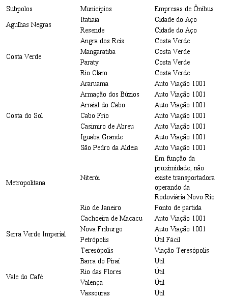 Desta forma, torna-se necessário entender como está se dando a mobilidade terrestre desse turista da cidade do Rio de Janeiro aos subpolos do IOT, a partir do principal terminal de passageiros da cidade e, também, quais são as empresas de ônibus que estão operando esses respectivos trajetos e para melhor compreensão, trabalha-se com a figura a seguir.