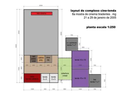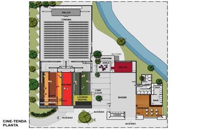Houve ainda uma evolução no funcionamento das tendas (fig. 12), que passaram a ter os espaços integrados, com maior conforto e uma preocupação com a circulação do público, atendendo ao fluxo de entrada e saída da sala de cinema. A fachada, por sua vez, ganhou uma volumetria mais destacada, reunindo as tendas e criando uma linguagem mais coerente com a imagem do evento (fig.13).