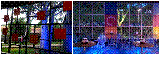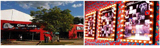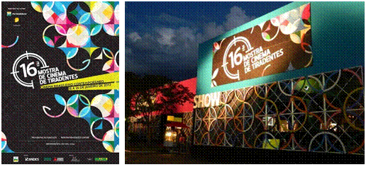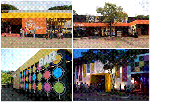 Assim, houve uma reformulação de toda a estrutura física como resultado de novas experimentações programáticas e inovações formais. Uma das premissas do projeto era o melhor aproveitamento da área do estacionamento (Rocha, comunicação pessoal, outubro de 2018). Neste primeiro projeto, as intervenções formais ainda foram tímidas, mas bastante significativas. Hallak (comunicação pessoal, setembro de 2018) destaca a transição de uma imagem de circo - já abandonada havia 2 edições - para uma imagem com referências ao cinema. Neste sentido, foi criado um foyer, com inspiração nos cartazes com luzes, característicos dos cinemas antigos, utilizando a chita, alusão à mineiridade (fig.9). A fachada recebeu uma grande testada em tecido e houve uma evolução na linguagem gráfica, que incorporou os elementos da cenografia. (Rocha, comunicação pessoal, outubro de 2018).