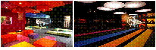 Até então trabalhando de forma autônoma, na 11º edição, a arquiteta Renata Rocha se associou ao arquiteto José Ricardo e, nas edições seguintes, é possível verificar uma evolução significativa no design interior (fig. 10). Os espaços de convívio, como café, lounge e bar, ganharam um acabamento mais elaborado, aproximando-se de espaços permanentes de cinema, em termos de conforto e funcionalidade. Segundo Rocha (2018), nesta época, surgiu uma demanda maior de espaços exclusivos por parte dos patrocinadores, com uma ambientação mais elaborada, para colocação das marcas.