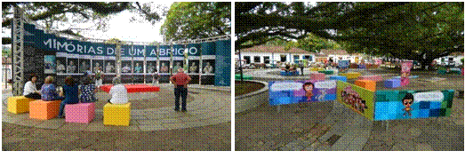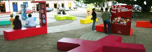 O Largo das Forras também tem sido explorado na fase atual da Mostra. A disposição anterior para a tela foi mantida, agregando uma área expositiva em estrutura de alumínio curvo, acompanhando o desenho da praça, na qual são expostos painéis fotográficos que procuram dialogar com a cidade e com a sua história. (fig.20). A turma do Pipoca, bonecos que retratam os personagens do cinema, colore o espaço público resgatando brincadeiras antigas. A praça se coloca como lugar de encontro, descanso e diversão, mantendo uma relação com sua função urbana.